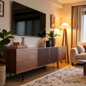 Đầu tiên là Sự ấm áp và tin cậy đến từ Gỗ Teak và Gỗ Óc chó : Đây là điểm mấu chốt của phong cách này. Hãy quên đi những tấm gỗ công nghiệp dán veneer vô hồn và lạnh lẽo đi. mid century modern đòi hỏi sự chân thật. Nó là gỗ thịt, màu nâu trầm mặc, những đường vân gỗ cuộn sóng đầy kiêu hãnh như dòng chảy của thời gian. Khi bạn chạm tay vào, bạn cảm nhận được hơi thở của rừng già, sự vững chãi, ấm cúng của một người đàn ông trụ cột, người luôn ở đó để che chở, không bao giờ rời đi.
