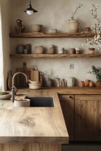Phải Sử Dụng Vật liệu Chân thực và Thô mộc: Đây là yếu tố cốt lõi. Hãy nghĩ đến gỗ thô còn nguyên vân và vết nứt, đá tự nhiên, gốm sứ mộc mạc (không tráng men bóng loáng), vải lanh nhăn một cách tự nhiên, kim loại đã bắt đầu oxy hóa. Không có gì là giả tạo, không có gì cố gắng che giấu bản chất thật của nó.